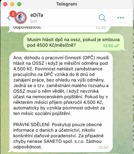 - Po prvním přihlášení vás eDiTa přivítá a můžete začít pokládat dotazy.